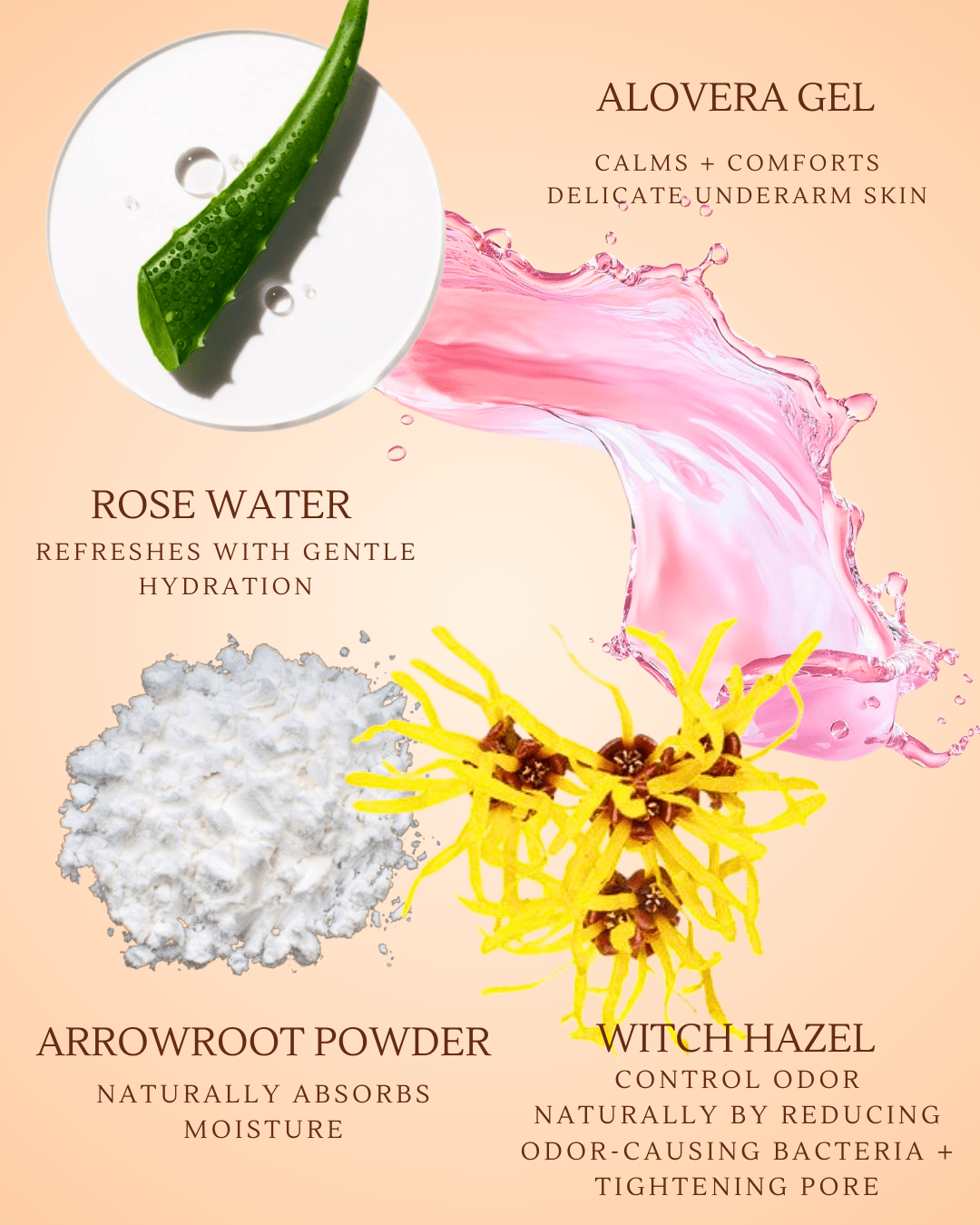 • Alovera Gel • Distilled Rose Water, • Arrowroot Powder, • Vitamin E, • Witch Hazel, • Essential Oils, • Glycerine, • Pottasium Sorbate & Sodium Benzoate